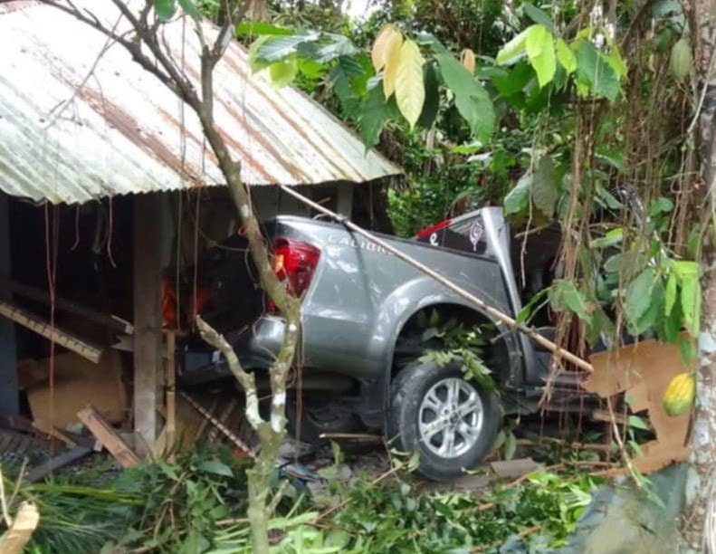 Isa ang patay, tatlong iba pa ang sugatan ng lumihis ang isang pick-up truck at bumangga sa isang waiting shed bago tuluyang bumulusok sa malalim na gilid ng highway sa Macalelon, Quezon nitong Miyerkules, June 11, 2025. (June 12, 2025, handout photo)