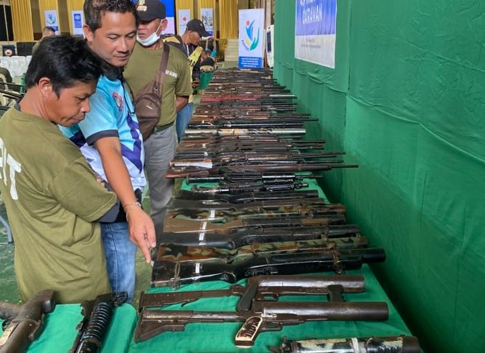 Officials presented to the public on Thursday, November 6, in a symbolic rite in the hinterland Upi town in Maguindanao del Norte 603 combat weapons, including assault rifles, shotguns, grenade and rocket launchers, villagers turned in during the past 11 months in support of a disarmament program assisted by the United Nations Development Program.